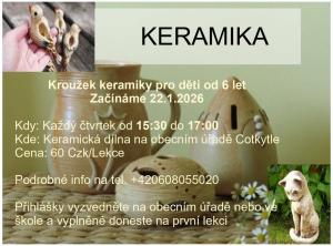Každý čtvrtek, poprvé 22.01.2026, v době od 15:30 do 17:00 hodin, bude v keramické dílně na obecním úřadě v Cotkytli probíhat kroužek keramiky.