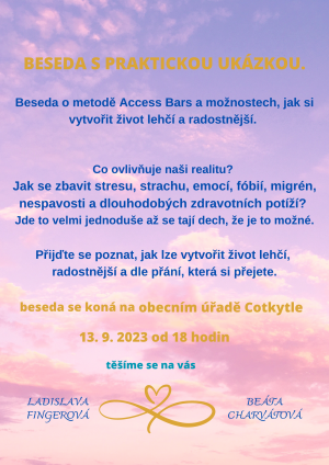Již tuto středu, tedy 13.09.2023, proběhne od 18 hodin v budově obecního úřadu beseda o metodě Access Bars a možnostech, jak si vytvořit život lehčí a radostnější.