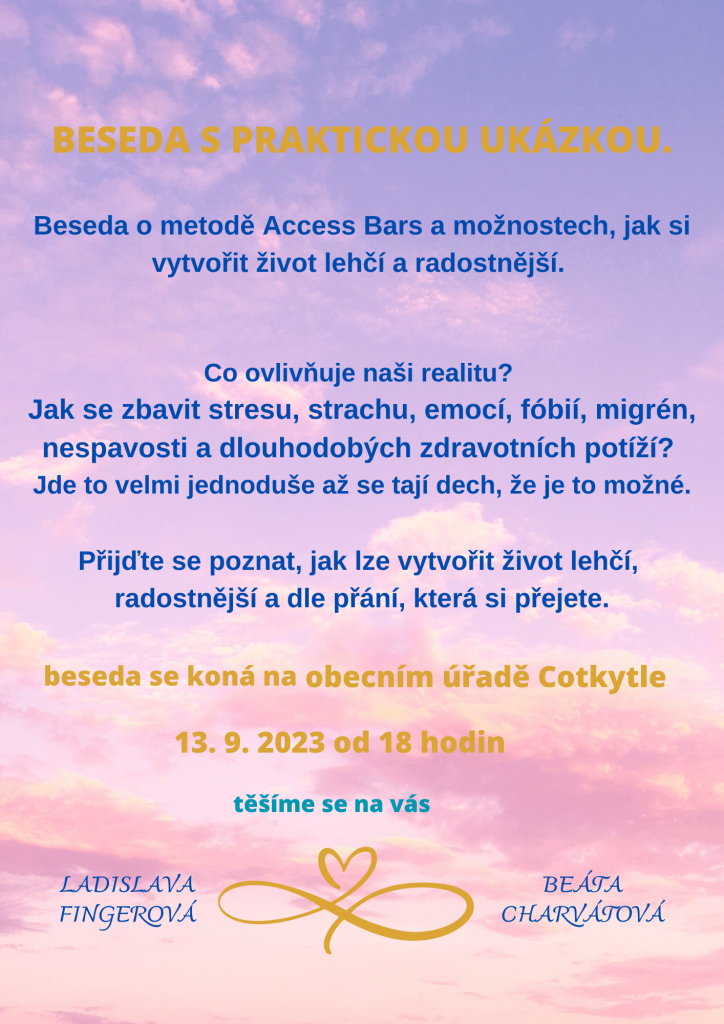 Zítřejší beseda o metodě Access Bars s praktickou ukázkou, která měla proběhnou od 18 hodin na obecní úřadě, je z důvodu rekonstrukce sociálního zařízení, přesunuta do prostor "hospody" v 1. patře kulturního domu v Cotkytli.