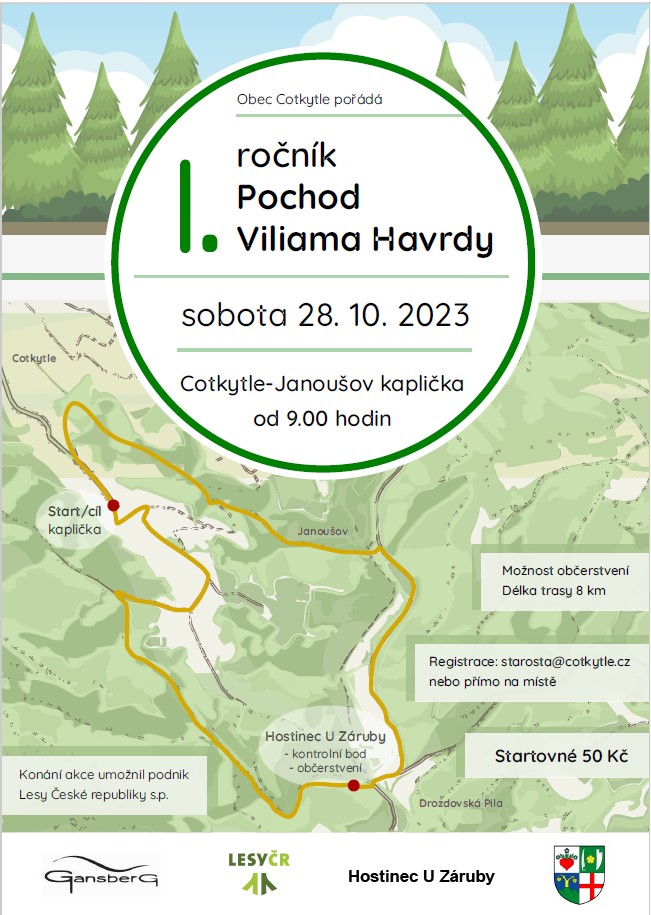 Při předchozí registraci na emailu starosta@cotkytle.cz, předmět Pochod Viliama Havrdy, nejpozději do 22.10.2023, obdržíte na startu malé občerstvení, diplom a medaili v cíli. Při pozdější registraci nemusí být zaručeno dostatečné množství medailí! Do registračního emailu stačí uvést počet účastníků. PROSÍM, přihlášku berte jako závaznou!