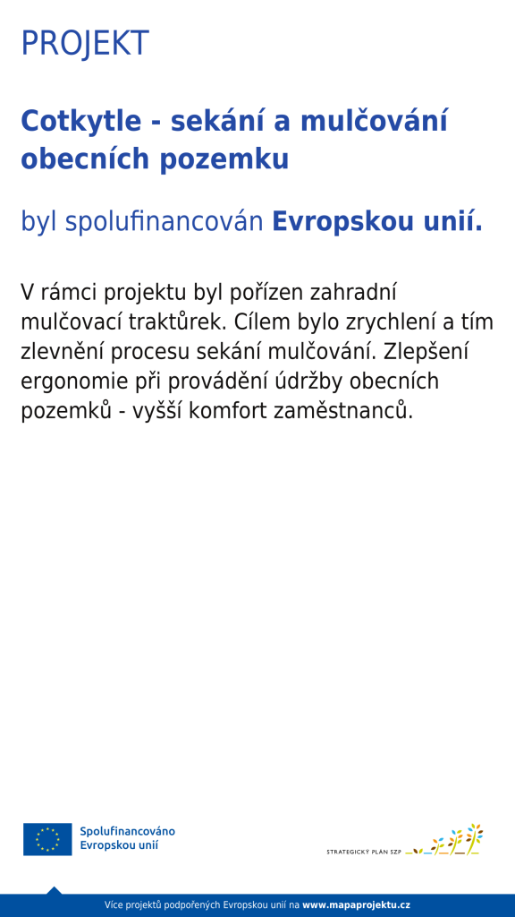 Jedná se o sekací traktůrek zn. SECO MP 122, jehož pořizovací cena 454.000,-Kč byla ponížena o 198.440,-Kč z dotace na projekt rozvoje venkova v rámci Strategického plánu Společné zemědělské politiky na období 2022-2027 poskytnuté Státním zemědělským intervenčním fondem prostřednictvím MAS Lanškrounsko.