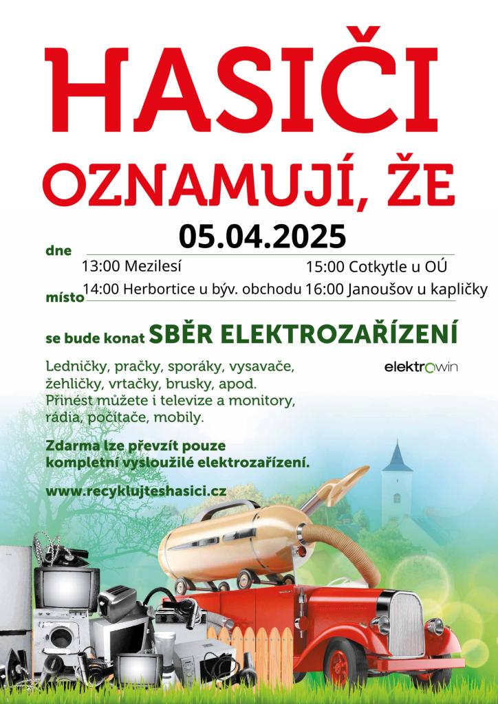 Elektroodpad můžete přinést v sobotu 05.04.2025 ve 13:00 hodin na Mezilesí k bývalé hasičárně, ve 14:00 hodin v Herborticích k bývalému obchodu, v 15:00 hodin k obecnímu úřadu v Cotkytli a v 16:00 hodin v Janoušově u kapličky.