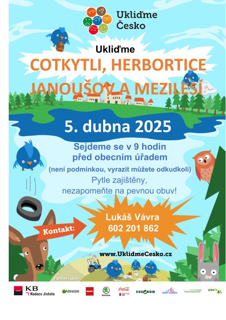 V sobotu 05.04.2025 od 9 hodin se zapojíme do celorepublikové úklidové akce Ukliďme Česko. Pravidla jsou jednoduchá. Posbíráme veškerý odpad ležící na krajnicích, příkopech, mezičkách, loukách a kdekoliv, kde nemá co dělat. Pytle na sběr si můžete vyzvednout na obecním úřadě, nejpozději však v sobotu 05.04.2025 v 9 hodin. Poté se rozejdeme na různá místa.
